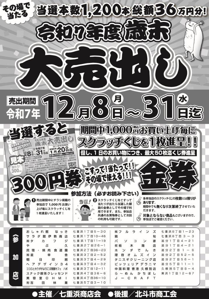 七重浜歳末大売出し12/8~31 日付 2025年12月8日 詳細 開催期間:令和7年12月8日(月)~12月31日(水) 対象 どなたでも参加頂けます。 カテゴリー イベント市内商店会 関連ファイルダウンロード 歳末大売出しチラシ