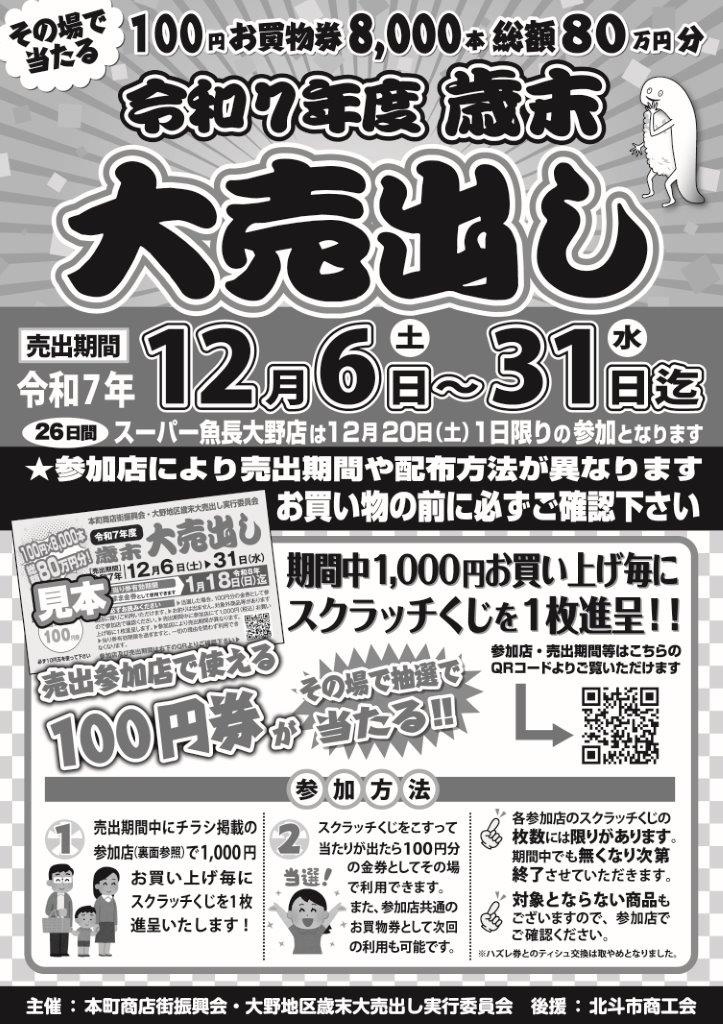 大野地区歳末大売出し12/6~31 日付 2025年12月6日 詳細 開催期間:令和7年12月6日(土)~12月31日(水)26日間 ※注スーパー魚長大野店は、12月20日(土)1日限りの参加(無くなり次第終了) 対象 どなたでも参加頂けます。 カテゴリー イベント市内商店会 関連ファイルダウンロード 歳末大売出しチラシ