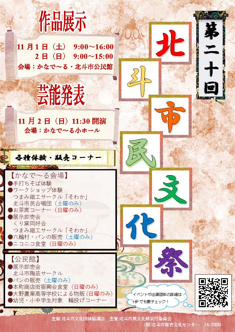 本町商店街振興会食堂協力(日曜のみ):第20回北斗市民文化祭 日付 2025年11月2日 11:00 AM – 1:30 PM 会場 北斗市公民館 詳細 本町商店街振興会では、11月1日(土)~2日(日)に開催される、第20回北斗市民文化祭において、「本町商店街振興会食堂」を11/2(日)北斗市公民館会場において実施いたします。 詳細については、北斗市ホームページ等をご確認下さい。 対象 カテゴリー 受託団体 関連リンク : 【11月1日・2日開催】第20回北斗市民文化祭 関連ファイルダウンロード